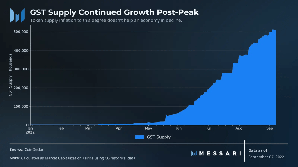 Falling demand is only one side of the problem. On the other side of the equation is an exponentially increasing supply. There is no supply cap for GST, the utility token has experienced hyperinflation of the supply in the past few months.
